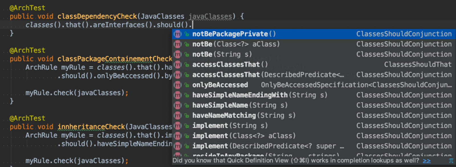 아래의 그림은 ArchUnit 라이브러리를 사용하는 모습인데, 이를 통해 의존성 방향이나 클래스의 가시성 등을 검사하는 자동화된 테스트 코드를 작성할 수 있다. 따라서 컨벤션이나 제약을 준수하는지 검사하고자 하는 경우에 유용하다.