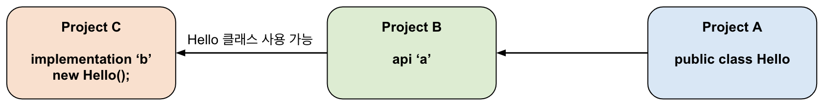 api는 전이 의존성에 해당하는 클래스를 컴파일 경로에 노출시킨다는 특징이 있다. 아래의 그림에서 B가 A를 api로 의존하고 있기 때문에 A에 대한 전이 의존성이 있는 C도 A의 클래스를 사용할 수 있게 되는 것이다.