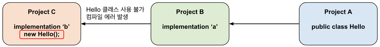 만약 이것을 implementation으로 바꾼다면 컴파일 에러가 발생하면서 Hello 클래스를 사용할 수 없게 된다.