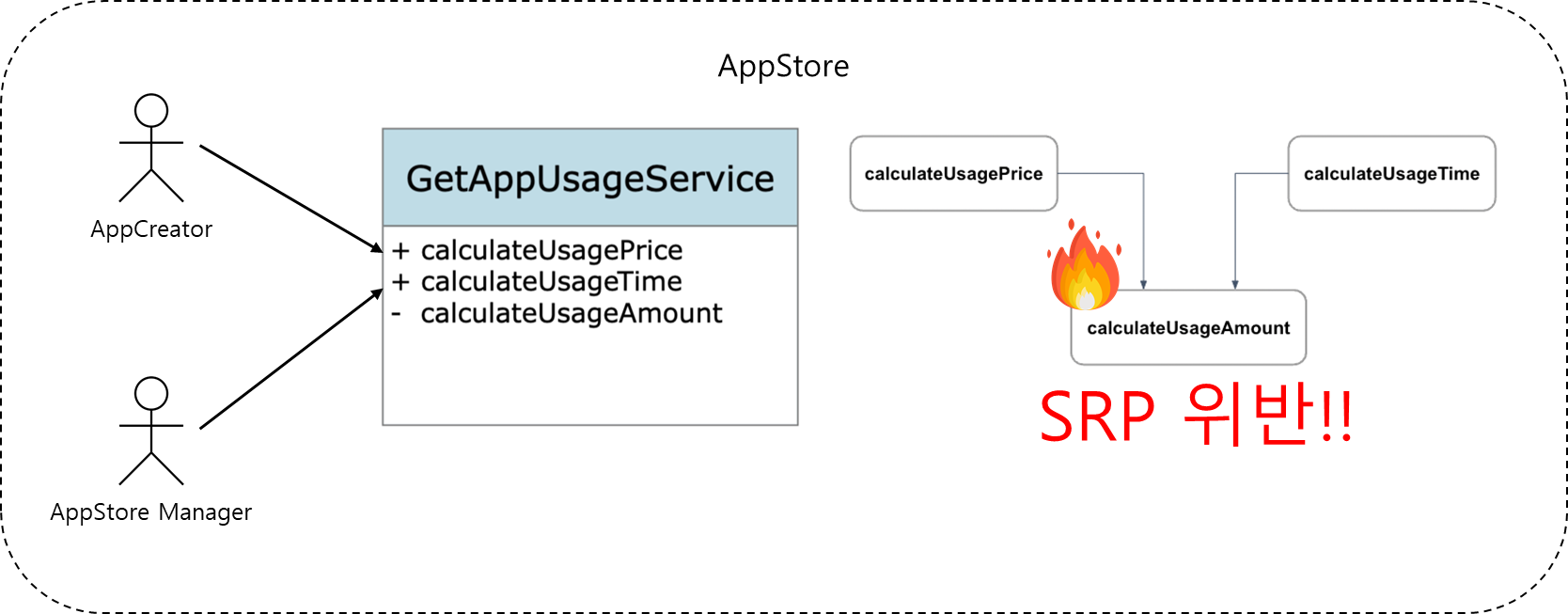 예를 들어 AppStore에 등록된 앱의 사용량을 측정하는 메소드가 있다고 하자. 앱을 만드는 사람은 사용량을 바탕으로 사용 금액을 계산해서 비용을 청구하고 있다. 앱을 관리하는 사람은 사용량을 바탕으로 사용 시간을 보고하고 있다. 이런 상황에서 앱의 사용량을 측정하는 메소드는 2명의 액터를 책임지기 때문에 SRP를 위반하는 것이다.