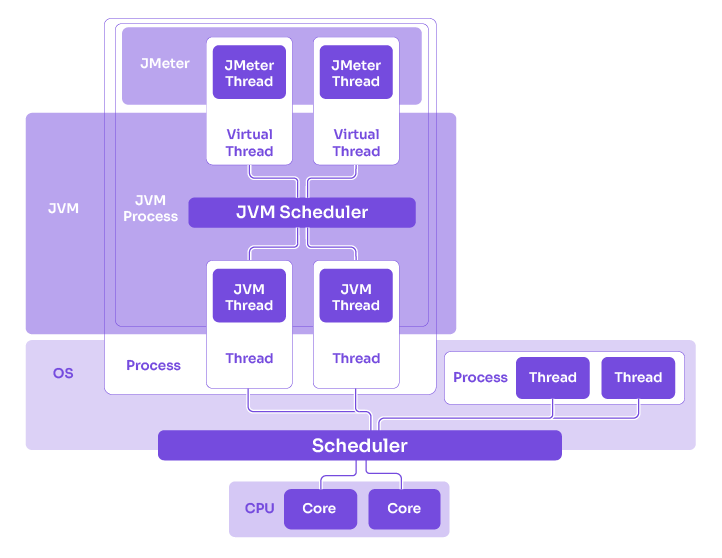 어떤 작업을 수행하려면 프로세서 코어에 스레드를 할당해야 하는데, 가상 스레드가 JDK 자체 스케줄러에 의해 플랫폼 스레드에 마운트되면, 플랫폼 스레드가 OS 스케줄러에 의해 프로세서 코어에 할당되어 작업이 수행된다. JDK의 스케줄러는 FIFO로 동작하는 work-stealing ForkJoinPool으로, LIFO로 동작하는 ParallelStream 풀과 독립적이다.