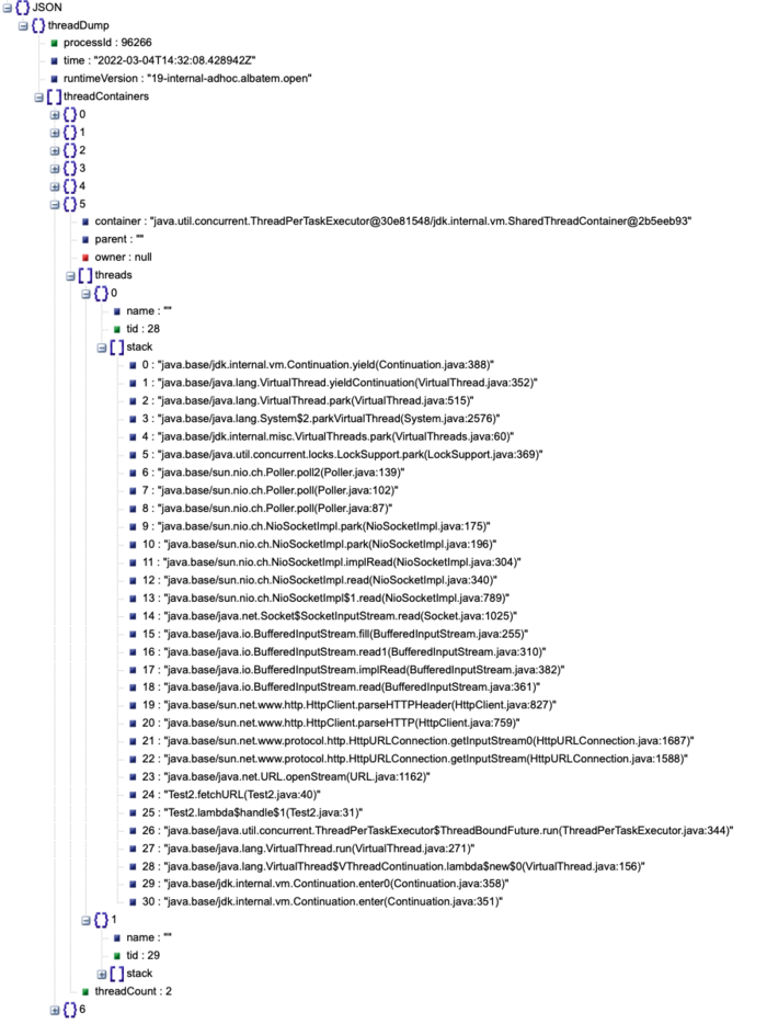 jstack 또는 jcmd로 얻는 JDK의 기존 스레드 덤프는 수평적인 스레드 목록을 제공한다. 이는 적은 수의 플랫폼 스레드에는 적합하지만 수 많은 가상 스레드에는 적합하지 않다. 따라서 기존 스레드 덤프를 확장하지 않고, 플랫폼 스레드와 함께 가상 스레드를 의미 있는 방식으로 그룹화하여 표시하는 새로운 종류의 스레드 덤프를 jcmd에 도입하였다.