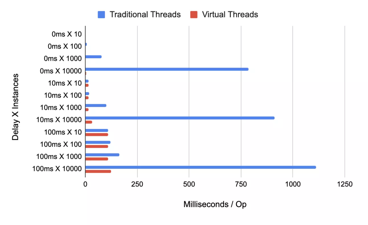 스레드 풀을 통해 약 200개 정도의 플랫폼 스레드를 재사용하더라도, 결국 초당 200개 씩만 처리할 수 있기 때문에 크게 개선되지 않는다. 반면에 가상 스레드는 충분한 워밍헙 후에 초당 약 10000개를 처리할 수 있다.