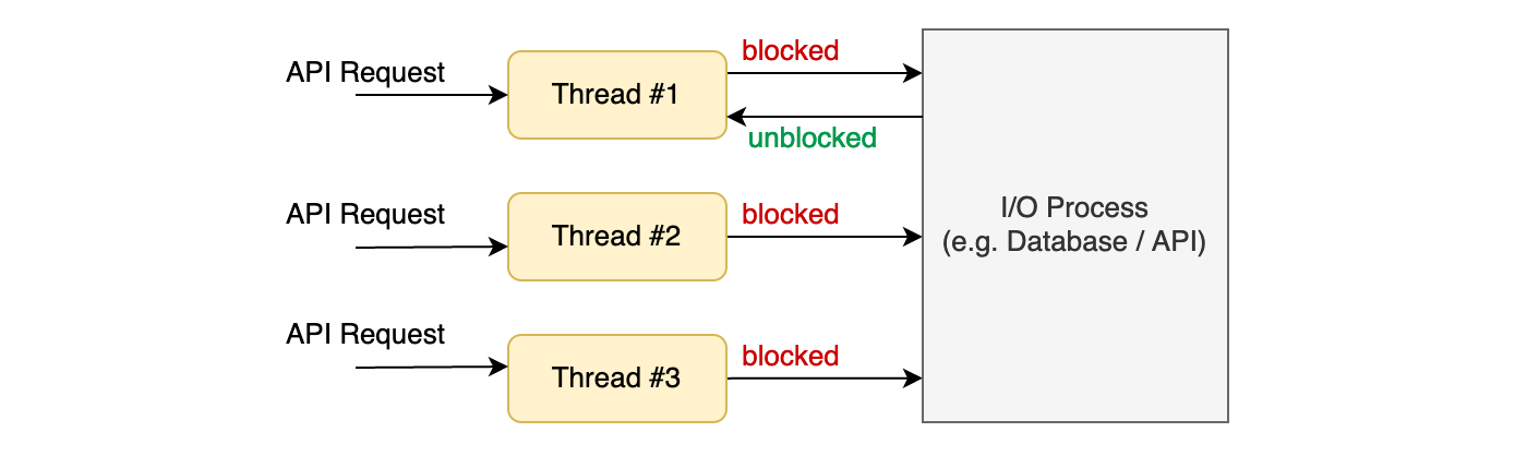 예를 들어 멀티 스레드 기반의 스프링 애플리케이션 서버에 요청이 들어왔다고 하자. 그러면 톰캣의 스레드 풀에 존재하는 스레드는 CPU를 가지고 요청을 처리하게 된다. 그러다가 네트워크 요청이나 파일 쓰기 같은 I/O 작업을 만나면 CPU를 OS에 반환하고 실행할 수 없는 상태(Non-Runnable)가 된다.