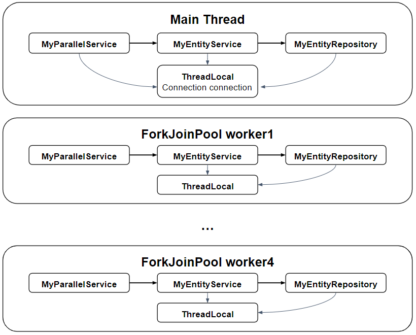 하지만 ThreadLocal은 스레드 별로 할당되는 공간이므로 ForkJoinPool 스레드의 ThreadLocal에는 커넥션이 존재하지 않는다. 따라서 MyEntityService는 @Transactional을 통해 새로운 커넥션을 가져와서 새롭게 트랜잭션을 시작한다.