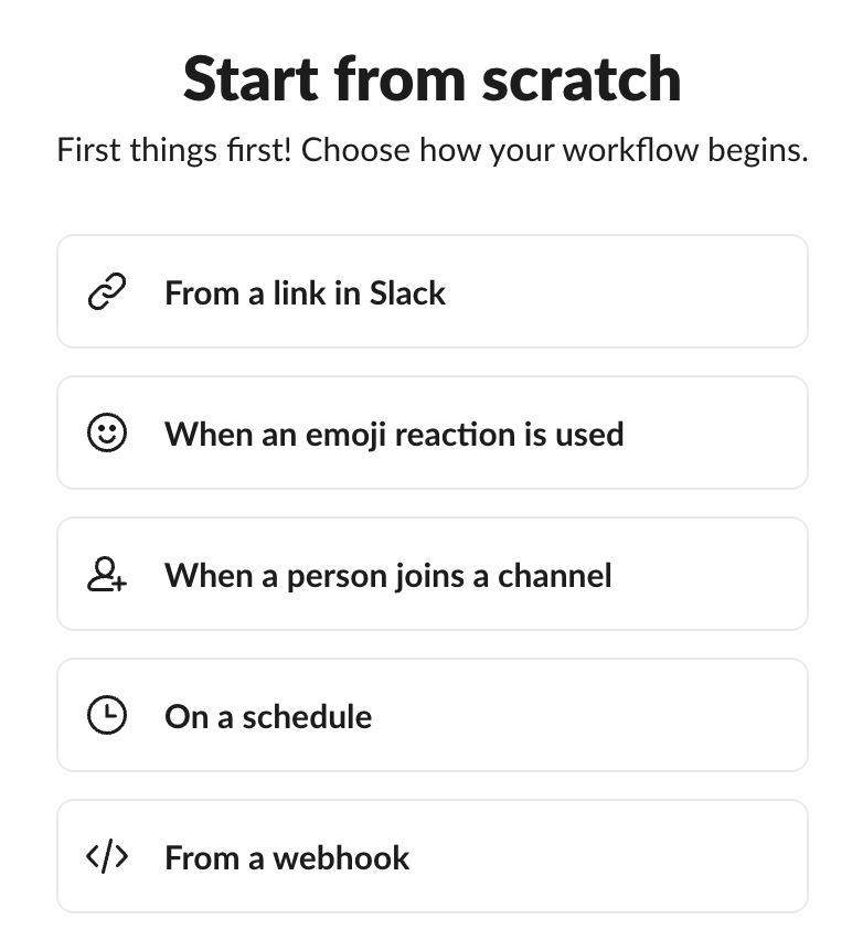 workflow를 어떻게 시작시킬 것인지를 고르는 부분이다. From a link in Slack을 선택하자. 그러면 Slash Command를 이용해 워크플로우를 실행할 수도 있다.