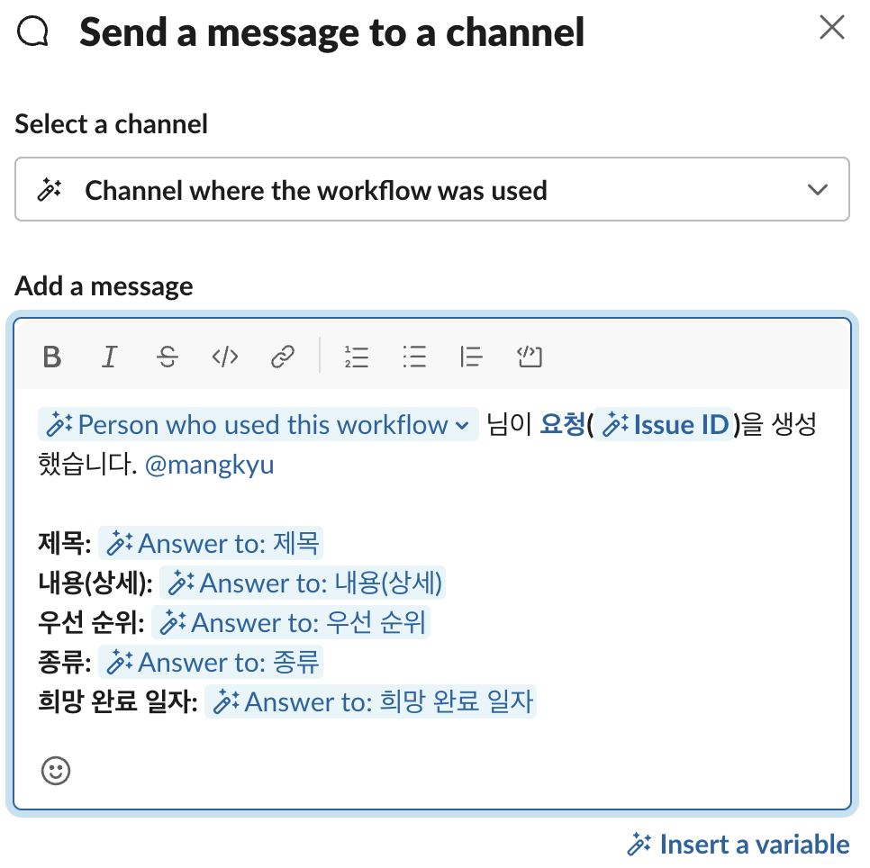 Insert a variable 기능을 활용하면 앞선 스텝들에서 설정된 변수들을 사용할 수 있다.