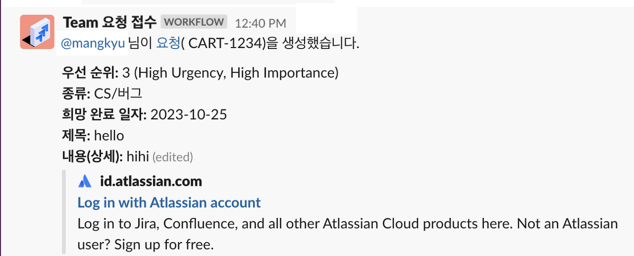 해당 메시지의 내용에서 지라 티켓으로 넘어갈 수 있도록 링크를 삽입해두었다. 원하는 텍스트에 다음과 같이 링크를 넣어주면 된다.