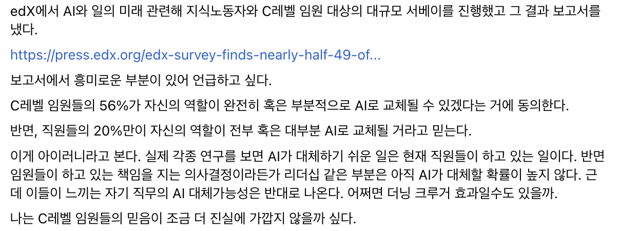 - 직원들은 본인이 AI에 대체될 확률이 20%밖에 안된다고 생각하지만, 임원들은 그 확률을 56%로 생각함