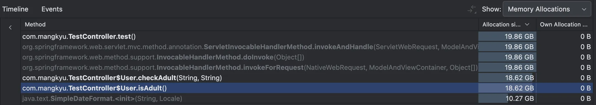 위의 결과에서 User.isAdult의 Allocation Size가 18.62GB라는 것은 해당 메서드가 실행되는 동안, 직접적 또는 간접적으로 총 18.62GB의 객체가 힙 메모리에 할당되었다는 뜻이다. 즉, isAdult()에서 직접 할당한 객체들 뿐만 아니라 내부의 다른 호출 메서드들이 할당한 객체들의 총 합이 18.62GB이라는 의미이다. 그리고 own allocation size가 0B라는 것은 해당 메서드 안에서 직접 new나 컬렉션 연산 등으로 생성된 것은 없다는 의미이다. 따라서 isAdult() 내부의 어떠한 메서드들에 의해 18.62GB나 할당되었는지 살펴보아야 할 필요가 있다. 자세한 분석 방법은 다음 포스팅을 참고하도록 하자.