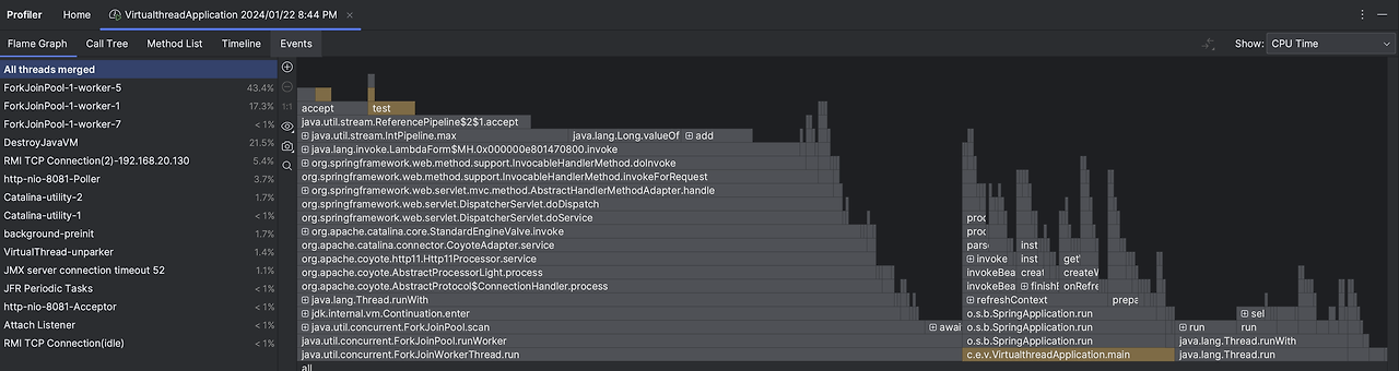 먼저 Flame Graph 같은 경우에는 다음과 같은 특징을 갖고 있다. Flame Graph는 스레드별로 그룹화되어 있다. 전체 스레드가 병합된 결과를 확인할 수도 있고, 특정 스레드를 선택하여 자세히 조사할 수 있다.