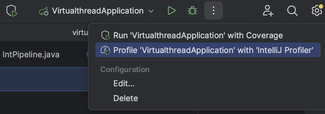 IntelliJ Ultimate를 사용하고 있다면, 다음과 같이 로컬 환경에서 프로파일링과 함께 서버를 실행할 수 있다. 비록 async-profiler는 아니지만 인텔리제이가 제공하는 프로파일러 역시 유용하다.