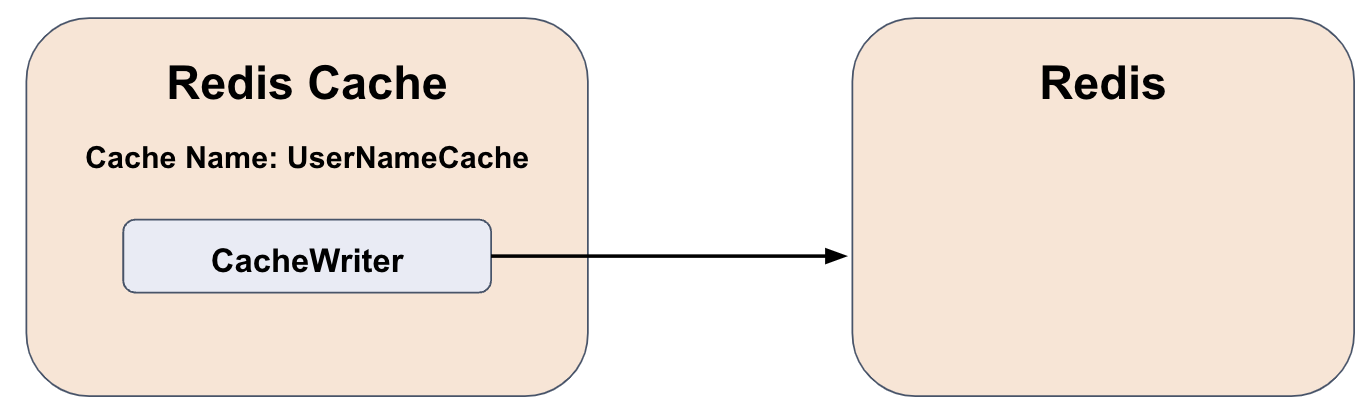 외부 저장소에 실제 값을 저장하는 Redis Cache와 같은 캐시들은 내부 구현이 다르다. Redis Cache도 동일하게 Cache Name을 namespace로 갖지만 실제 데이터는 외부 저장소에 존재하므로, 레디스 설정 시에 등록해준 CacheWriter를 통해 캐시 관련 연산을 수행한다.