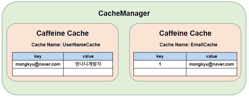 애플리케이션을 개발하다보면 다양한 캐시가 필요할 수 있다. 위에서 살펴본 UserName 캐시 외에도 UserPhone 캐시 등 다양한 캐시 객체가 필요할 수 있다. 스프링은 이러한 캐시 객체들을 관리하는 CacheManager라는 인터페이스를 제공한다. 자세한 구조를 표현하면 다음과 같다.