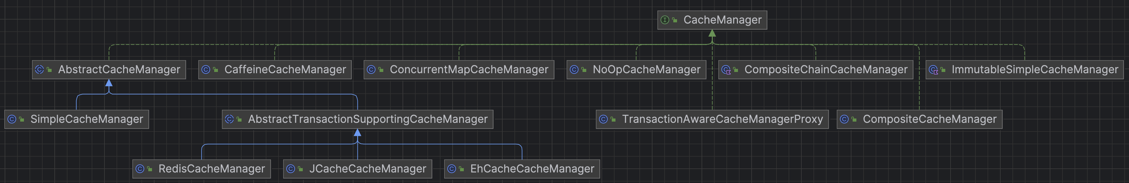 그 외에도 전체 캐시 이름 목록을 조회하는 메서드도 갖고 있다. 여기서 주의할 부분은 getCache 메서드 부분인데, 설명을 보면 구현체에 따라 캐시 매니저의 캐시가 lazy하게 생성될 수 있다는 부분이다. 이를 보다 자세히 이해하기 위해 CacheManager 구현을 살펴보도록 하자.