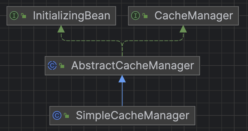 SimpleCacheManager는 내부적으로 ConcurrentHashMap을 사용하여 단일 인스턴스 내부에서 캐싱하기 위한 용도로 활용되는 CacheManager이다. SimpleCacheManager의 계층 구조를 자세히 보면, 실질적인 기능들은 공통 기능을 추상화한 AbstractCacheManager에 존재함을 확인할 수 있다.
