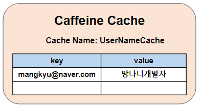 Caffeine Cache는 로컬 메모리에 값을 저장하는 인메모리 캐시로, ConcurrentHashMap을 사용하여 구현되어 있다. 예를 들어 우리가 사용자의 이메일을 바탕으로 닉네임 정보를 캐싱하는 UserName 캐시가 존재한다고 하자. 이를 도식화하면 다음과 같다.