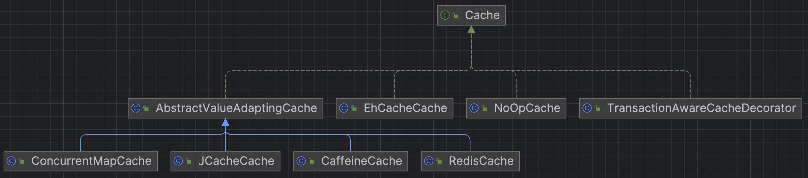 실제 스프링이 제공하는 구현체를 보면 로컬 캐시를 위한 CaffeineCache, 레디스를 위한 RedisCache 외에도다양한 캐시가 존재한다. 그리고 캐싱된 값을 래핑하는 공통 기능을 담당하는 추상 클래스도 일부 부모로 구현하고 있음을 확인할 수 있다.