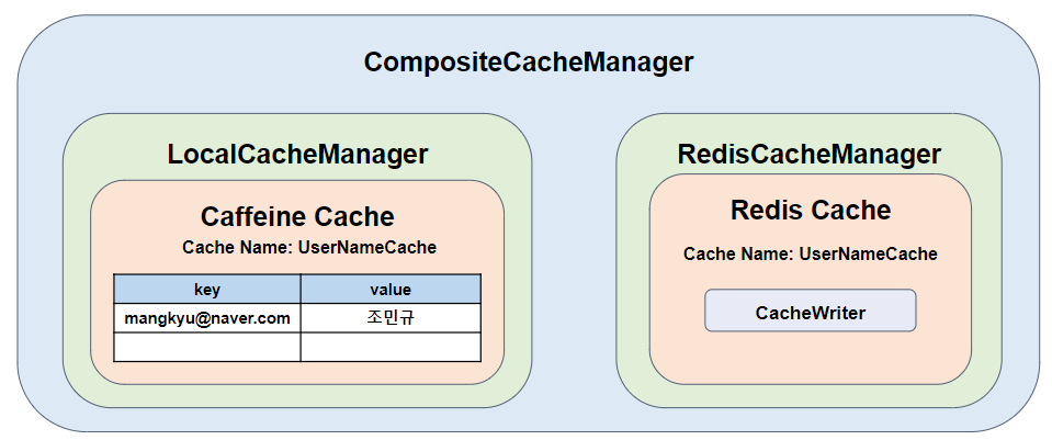 하지만 실제 서비스를 운영할 때는 로컬 캐시 외에도 레디스와 같은 분산 저장소의 캐시 모두 필요하다. 따라서 스프링은 로컬 캐시를 위해서는 SimpleCacheManager, 레디스를 위해서는 RedisCacheManager를 제공하며, 복수의 CacheManager 들을 관리하기 위한 CompositeCacheManager 역시 제공한다.