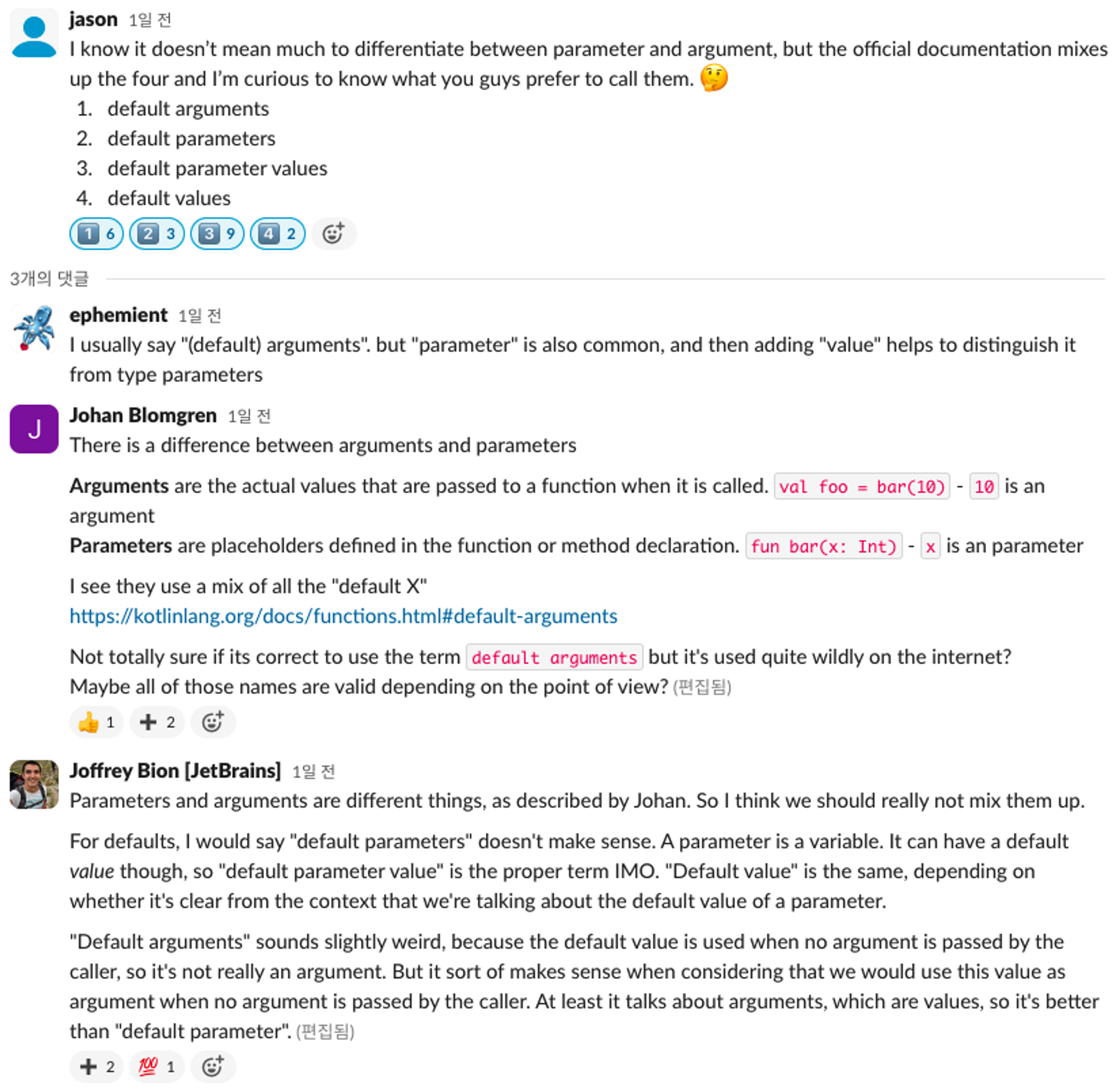 - “default argument” 역시 이치에 맞지 않는데, 전달된 값이 없을 때 “default value”가 사용되는 것이지 엄밀히는 “argument”는 아니기 때문임
