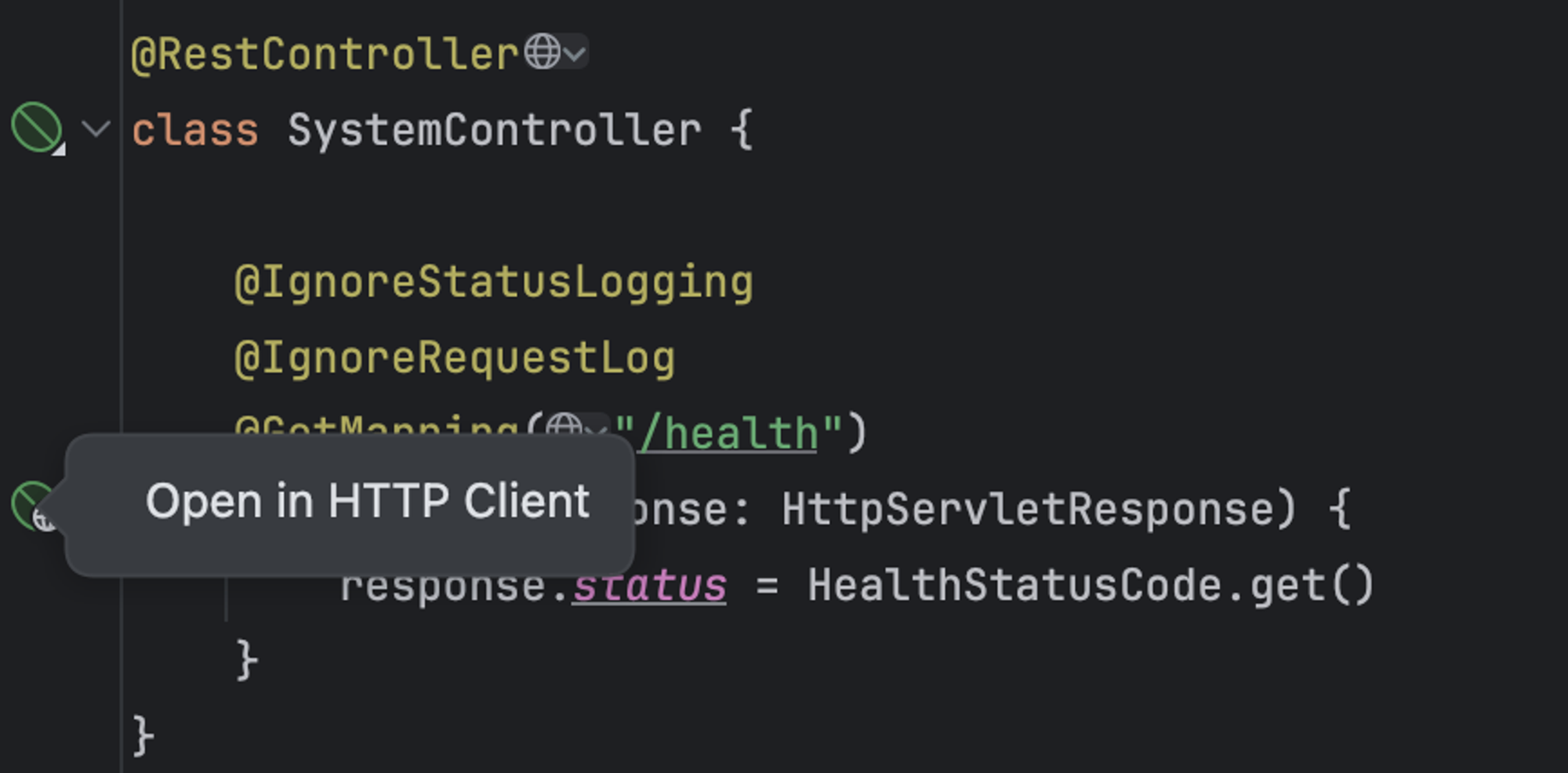 개인적으로는 최근에 Postman이 아닌 인텔리제이의 HttpClient를 주로 활용하고 있다. 이때 인텔리제이의 HttpClient 생성 자동화를 사용하면 편리한데, 다음과 같이 컨트롤러 옆에 있는 버튼을 클릭한다.