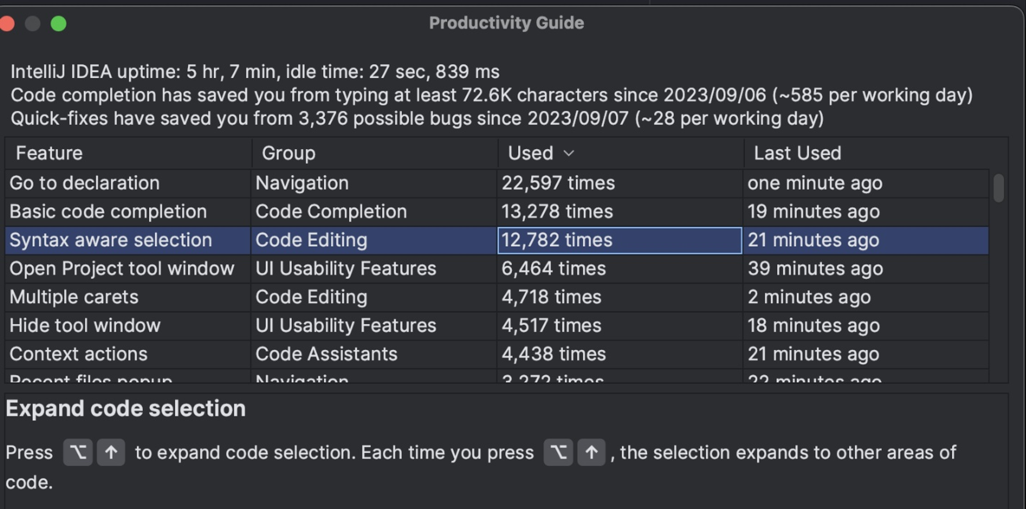 IntelliJ에서 Help > Productivity Guide 누르면 인텔리제이 사용 통계를 보여준다.