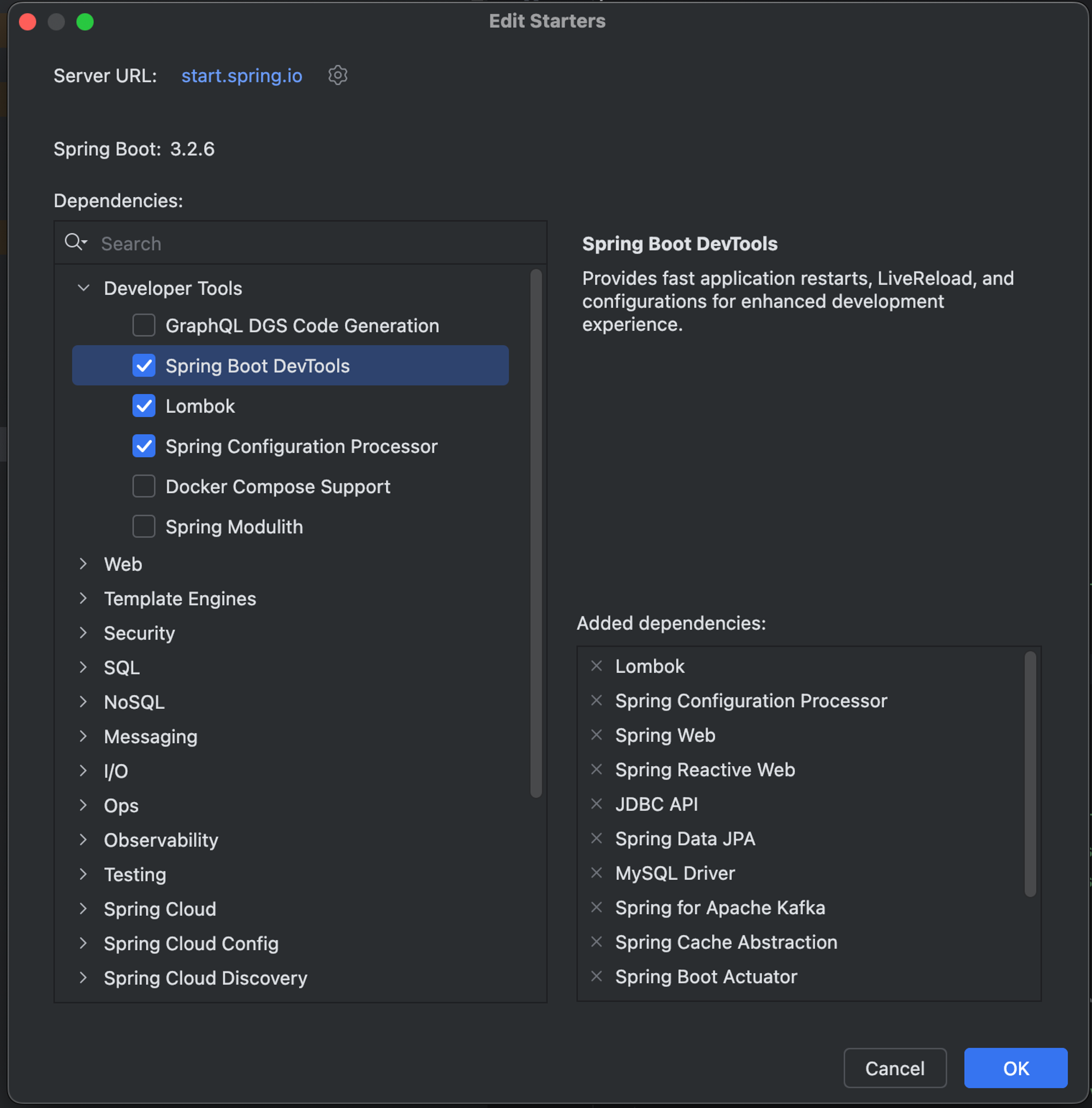 해당 부분을 사용하면 Starter 관련 의존성을 손쉽게 추가하고 삭제할 수 있게 해준다. 물론 마이너한 의존성은 지원하지 않지만, 이를 통해 어느 정도 불편함을 해소할 수 있다.