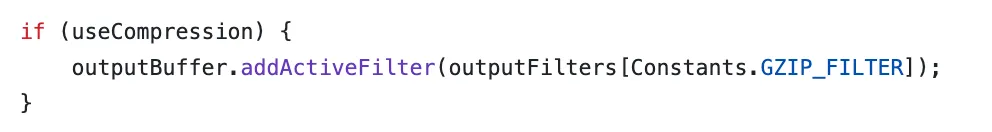 위에서 반환받은 압축 여부 값은 다음과 같이 Gzip 처리 필터인 GzipOutputFilter를 등록하는 데 사용되고, 최종적으로 해당 필터를 통해 응답 데이터를 생성할 때 압축을 적용하게 된다.