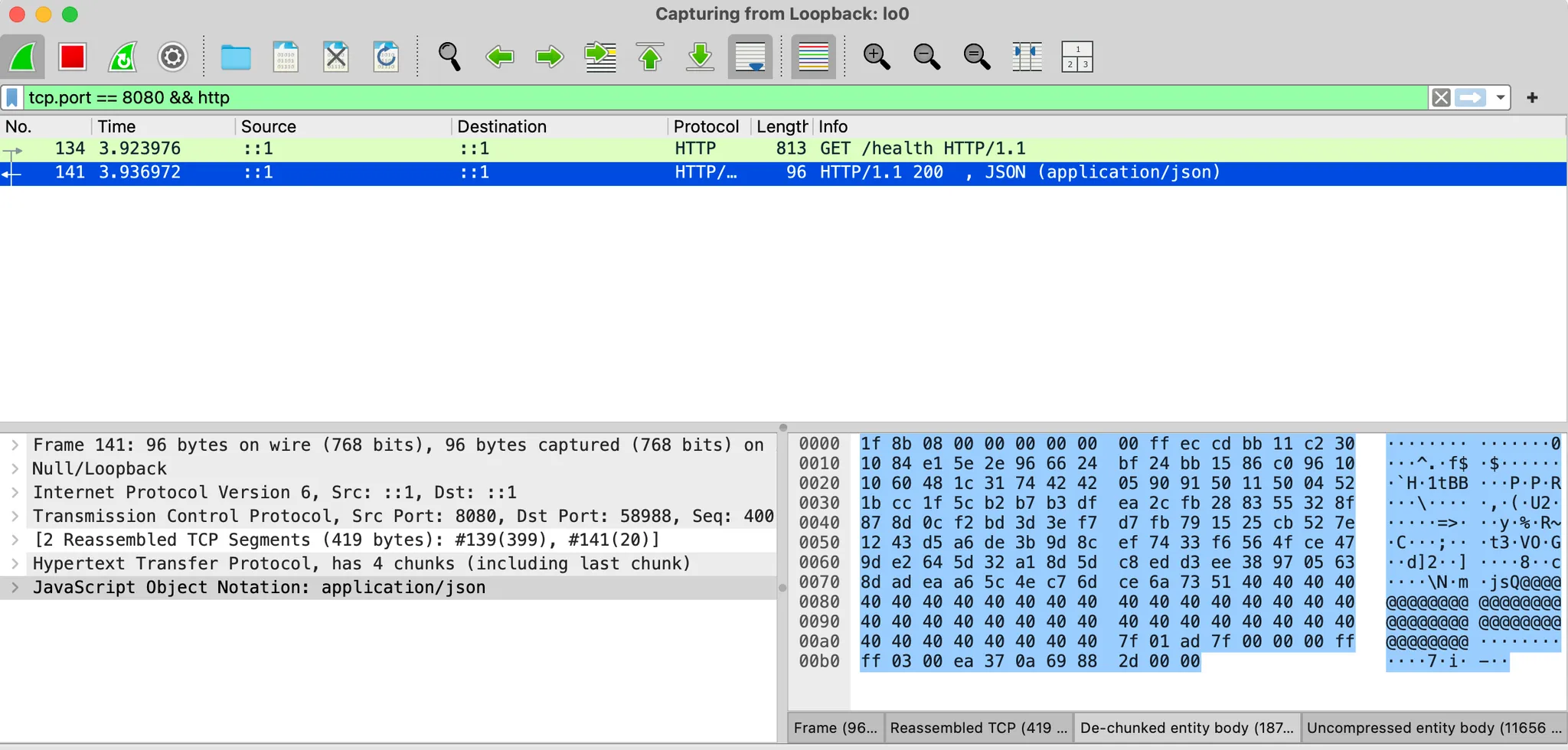 실제로 서버로부터 받은 패킷을 뜯어 확인해 보도록 하자. 다음과 같이 응답 페이로드의 데이터를 보면, gzip의 매직 넘버인 1F 8B(16진수)가 존재하며, 응답 전의 데이터는 11656 바이트로 조건에 맞춰 압축되었음을 확인할 수 있다.
