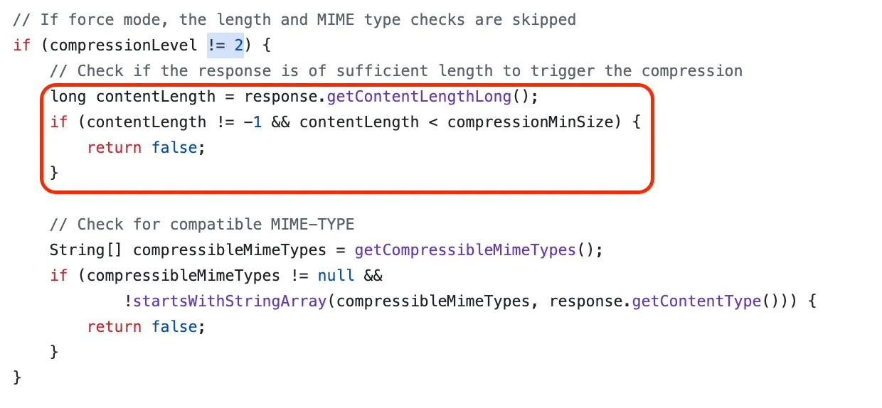 이러한 부분은 최종적으로 톰캣의 CompressionConfig 클래스에 전달되어 압축 여부를 결정(useCompression)할 때 사용된다. 압축 여부 판단 로직을 보면, 압축이 활성화 되어 있고, 응답 길이(content-length) 헤더의 값이 설정된 상태에서(-1이 아님) 응답 길이 조건을 만족하지 않는 경우에만 압축을 하지 않음을 확인할 수 있다. 즉, 응답 길이 헤더가 설정되지 않았다면, 항상 압축을 진행하는 것이다. 실제로 톰캣 공식 문서에 따르면 Content-Length 가 없을 때 응답을 압축을 한다는 이야기가 있다.