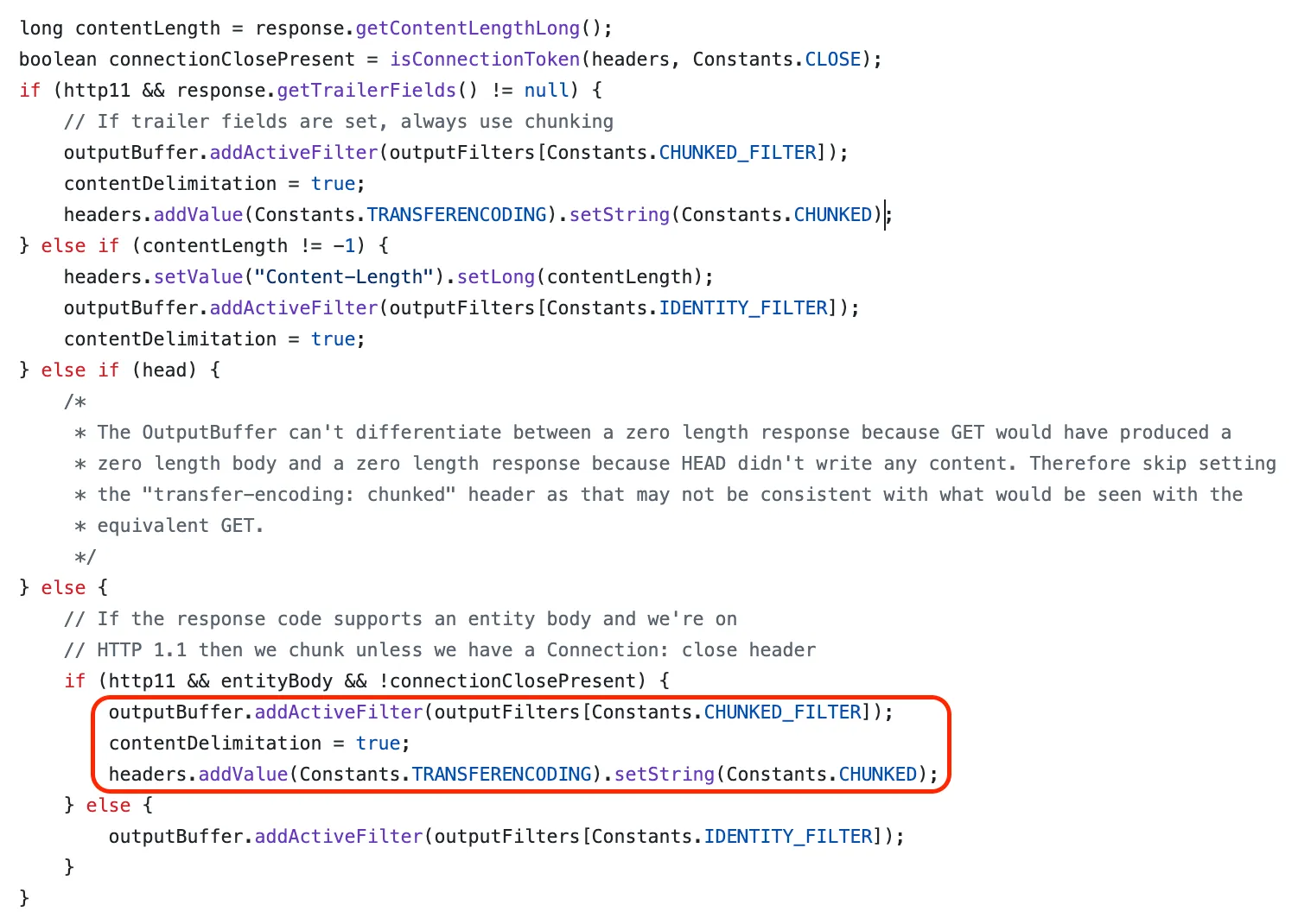 그리고 톰캣에서는 요청 타입이 application/json 이라면, Transfer-Encoding: chunked로 설정되는 로직이 존재한다. Transfer-Encoding: chunked 헤더는 응답 payload를 여러 개의 논리적 단위인 청크(chunk)로 나누어 이를 독립적으로 송/수신 함을 의미한다.
