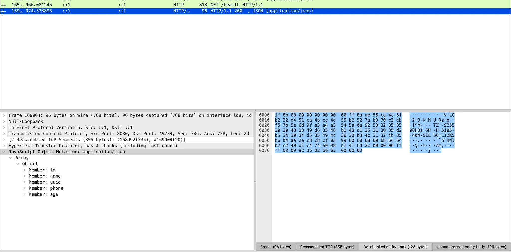 대량의 응답을 생성하여 테스트해보면, 다음과 같이 응답 헤더 중 Content-Encoding: gzip을 통해 응답이 gzip 압축되어 제공되었음을 확인할 수 있다.