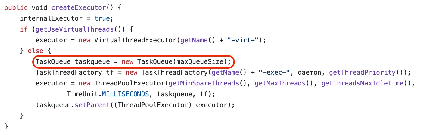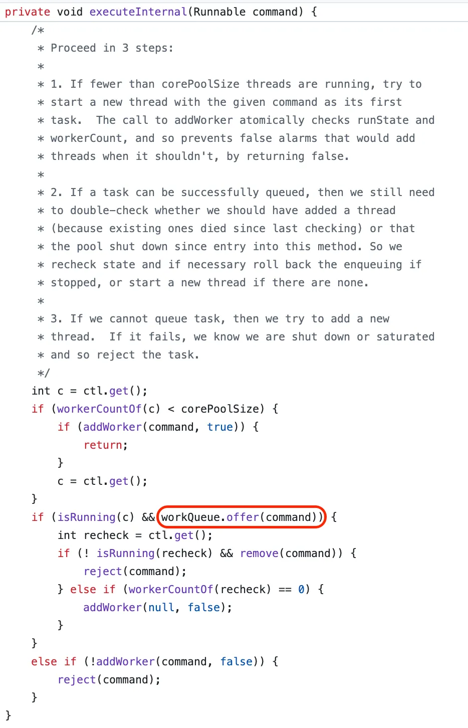 이러한 차이를 불러오는 부분은 작업을 제출하는 ThreadPoolExecutor의 execute 내부에서 TaskQueue를 활용하는 부분에 있다. 톰캣의 TaskQueue가 아닌 다른 일반적인 작업 큐를 사용했다면, 다음의 workQueue.offer() 부분에서 작업의 제출에 성공하게 된다. 따라서 maxPoolSize를 참고하여 초과 스레드를 생성하기 이전에 먼저 작업 큐를 채우는 것이다.