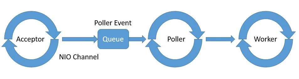 톰캣 내부 구현 상으로는 서버 소켓으로써 serverSocket.accept()를 수행하는 Acceptor 컴포넌트가 존재하며, 그 결과로 NIO 방식으로 소켓 연결을 처리하는 채널 중 하나인 NIO Channel(Non-blocking I/O 방식으로 클라이언트와의 네트워크 연결을 처리하는 객체)를 얻게 된다. 이후 Acceptor는 이를 내부적으로 PollerEvent라는 이벤트로 캡슐화하여 이벤트 큐에 이를 등록한다.