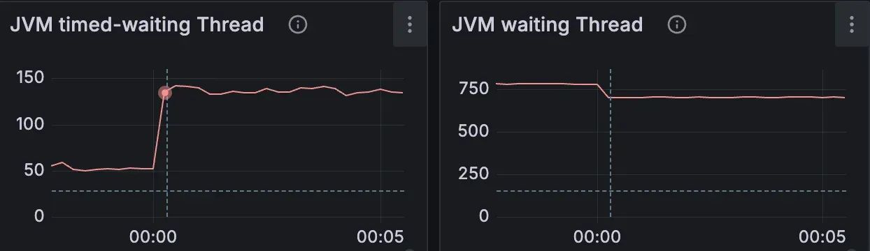 참고로 초과 스레드가 생성되어 활용되는 경우에는 ThreadPoolExecutor 구현에 따라 WAITING 상태의 스레드가 줄어들고, TIMED-WAITING 상태의 스레드가 증가함을 확인할 수 있음을 참고해두도록 하자. 관련 내용은 해당 포스팅을 통해 자세히 참고하도록 하자.