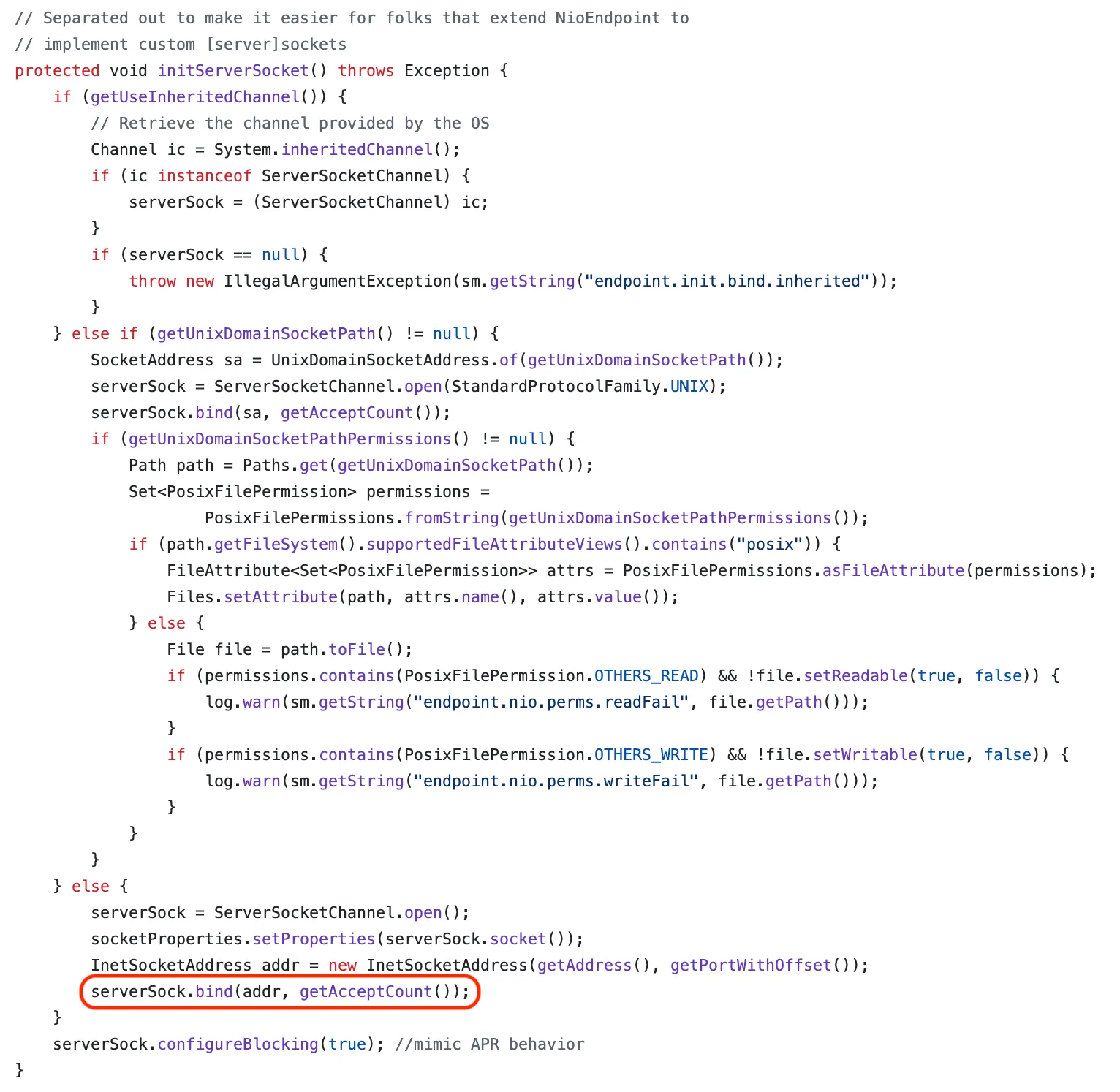 그리고 serverSocket.accept()를 하면 백로그 큐에 쌓인 연결 정보를 바탕으로 소켓을 반환받는데, 이때 백로그 큐에 쌓아둘 연결의 수를 관리하는 변수가 바로 accept-count 이다. 백로그 큐에 쌓인 연결의 수가 accept-count를 초과하면 운영체제는 추가적인 연결을 맺지 않는데, accept-count 변수는 NioEndpoint 라는 톰캣의 연결 구현체에서 ServerSocketChannel.bind()의 파라미터로 전달되고 있음을 확인할 수 있다.