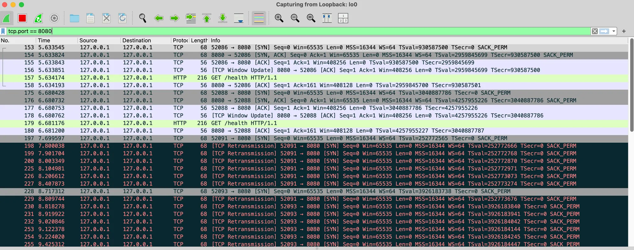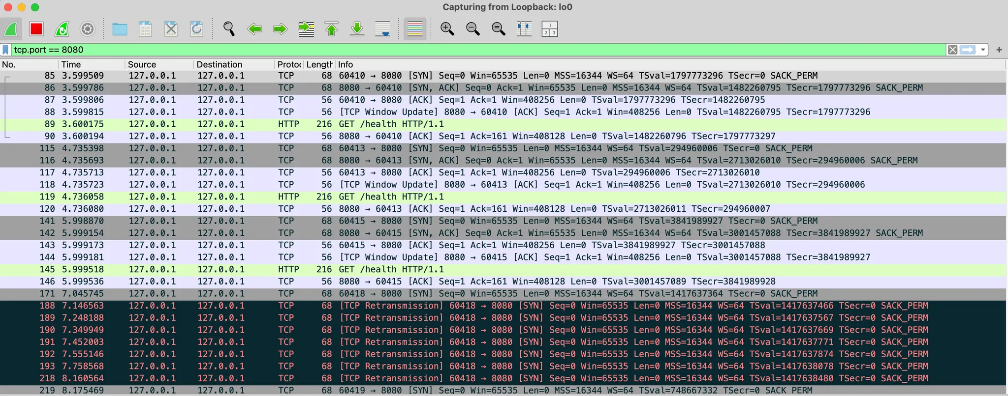 HTTP 역시 TCP를 기반으로 하기 때문에, 우리가 보내는 API 요청은 SYN-SYN/ACK-ACK 의 3-way handshake 과정으로 연결이 맺어지므로 wireshark를 통해 주고 받은 패킷을 분석해볼 수 있다.