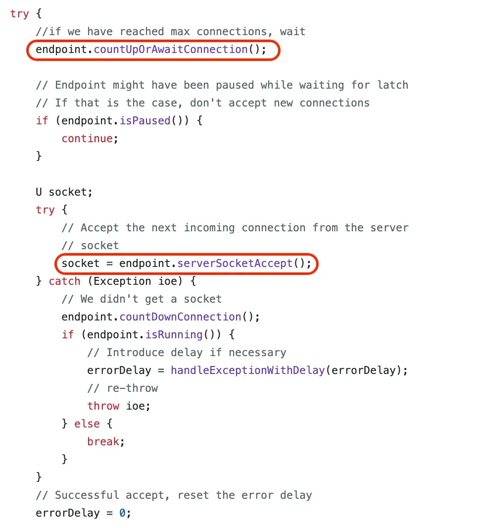 이러한 상황이 발생한 이유는 먼저 max-connections 값이 1로 설정되었기 때문이다. 앞서 설명하였듯 max-connections는 서버가 동시에 수락하고 처리할 수 있는 최대 연결 수이다. 기본적으로 톰캣에서 연결을 수락하는 컴포넌트는 Acceptor 컴포넌트임을 앞선 포스팅에서 살펴보았는데, 해당 컴포넌트의 로직을 살펴보면 다음과 같다.
