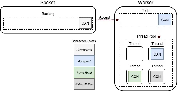 - 두 번째, 세 번째 요청은 정상적으로 연결이 맺어졌지만, max-connections에 도달하여 Acceptor 컴포넌트가 꺼내지 못하고 운영체제의 백로그 큐에 쌓여 있음