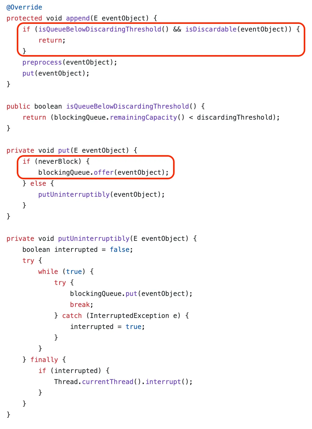 AsyncAppender는 큐에 로그를 먼저 적재하고, 실제 처리는 비동기로 수행되기 때문에 애플리케이션의 성능(특히 TPS)을 향상시킬 수 있다. 하지만 트래픽이 급증하여 쌓아야 하는 로그가 많아진 경우, 소비자가 큐의 로그 이벤트를 처리하는 속도보다 생산자가 로그 이벤트를 큐에 넣는 속도가 훨씬 빨라서, 큐(BlockingQueue)의 용량에 의한 문제가 생길 수 있다. 먼저, AsyncAppender의 로그 적재 로직(append)을 보면 다음과 같다. 참고로 다음의 코드는 AsyncAppender의 부모 클래스인 AsyncAppenderBase에서 확인할 수 있다.