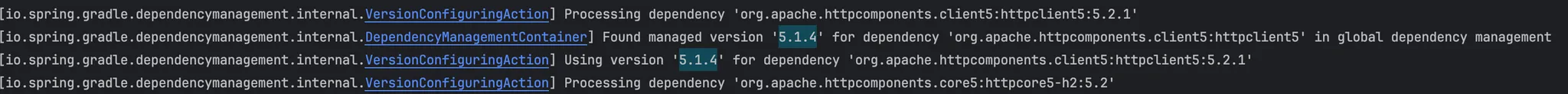- 더 높은 5.2.1 버전이 존재함에도 불구하고 최종적으로 선택된 httpclient5 버전은 5.1.4임