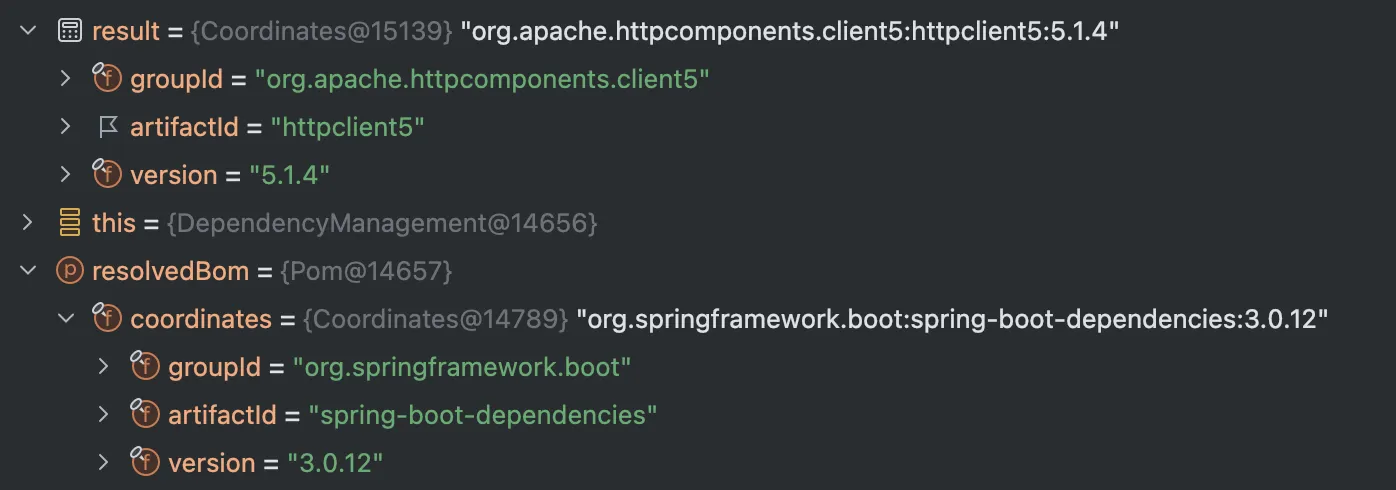 그리고 해당 부분에 BreakPoint를 걸고 실행을 해보면, 다음과 같이 Spring Dependency Management 플러그인에 의해 BOM이 추가되었고, 이로 인해 5.1.4 버전이 강제되었음을 알 수 있다.