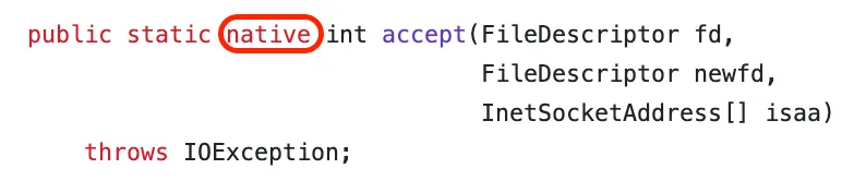 그리고 Net.accept()를 보면, 해당 부분이 native 메서드로 구현되어 있음을 확인할 수 있다.