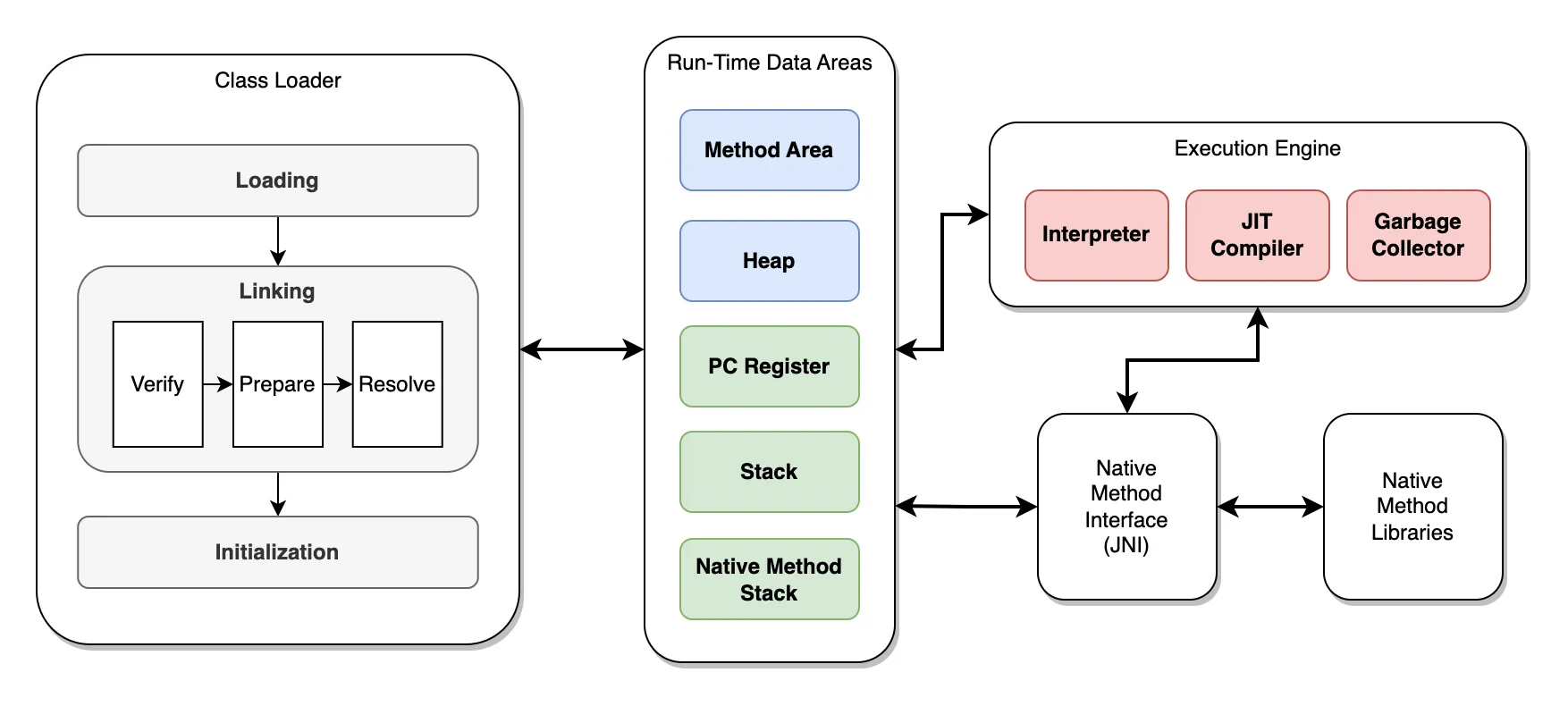 자바에서 native 키워드가 붙은 메서드는 자바로 구현되어 있지 않고, 플랫폼 의존적인 네이티브 언어(주로 C나 C++)로 구현된 메서드이다. JVM은 운영체제 시스템 콜 호출 등의 용도로 네이티브 메서드를 사용하는데, 이는 Java 만으로는 직접 호출할 수 없다. JVM 내부에는 JNI(Java Native Interface)가 존재하는데, 자바에서 native 메서드를 호출하면 JNI를 통해 C나 C++로 작성된 코드를 호출하게 되는 것이다. 참고로 네이티브 메서드의 호출은 우리에게 익숙한 Heap이 아닌 Native Method Stack이라는 영역에서 관리됨을 아래의 그림에서 확인할 수 있다.