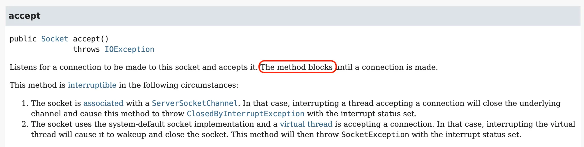 먼저 ServerSocket의 accept() 메서드에 대한 자바 공식 문서 내용을 살펴보도록 하자. 다음은 자바 24의 공식 문서를 기반으로 작성된 내용이다. 확실히 소켓에 대한 연결이 이루어지기를 수신하고 연결을 수락하며, 연결이 만들어질 때까지 차단된다고 나와있다.