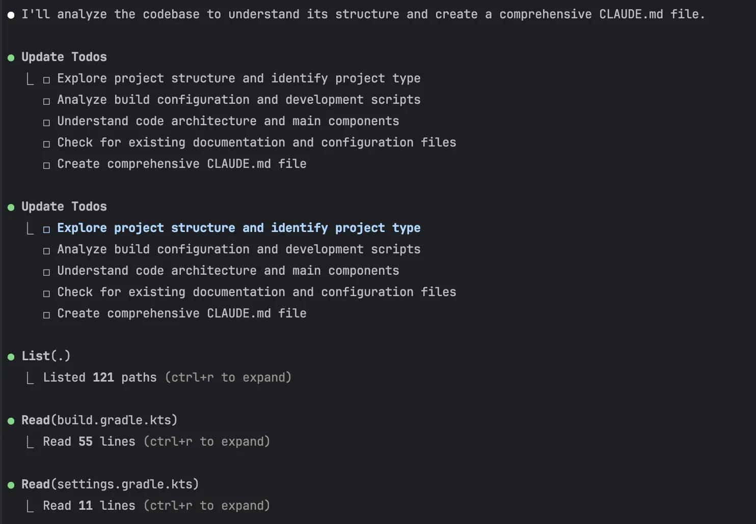 init 명령어를 실행하면 Claude Code가 다음과 같이 프로젝트를 분석하기 시작할 것이다.
