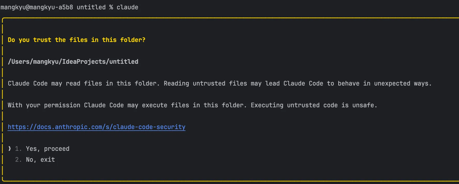 만약 매번 위와 같이 권한을 묻는 것이 번거롭다면, claude를 실행할 때 다음과 같이 --dangerously-skip-permissions 옵션과 함께 실행하여 권한 여부를 스킵시킬 수도 있다.