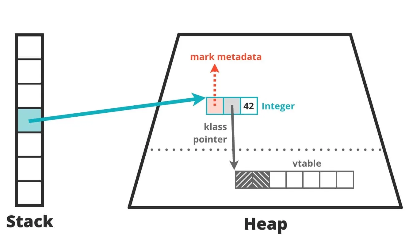 이러한 객체의 헤더 부분이 메모리 상에서 어떻게 구성되는지를 쉽게 표현하면 다음과 같다. 마크 워드는 메타데이터로 힙 내부에 존재하지만, 클래스 워드는 클래스 정보를 가리키는 포인터이기에 최종적으로 메타스페이스 영역을 향한다.