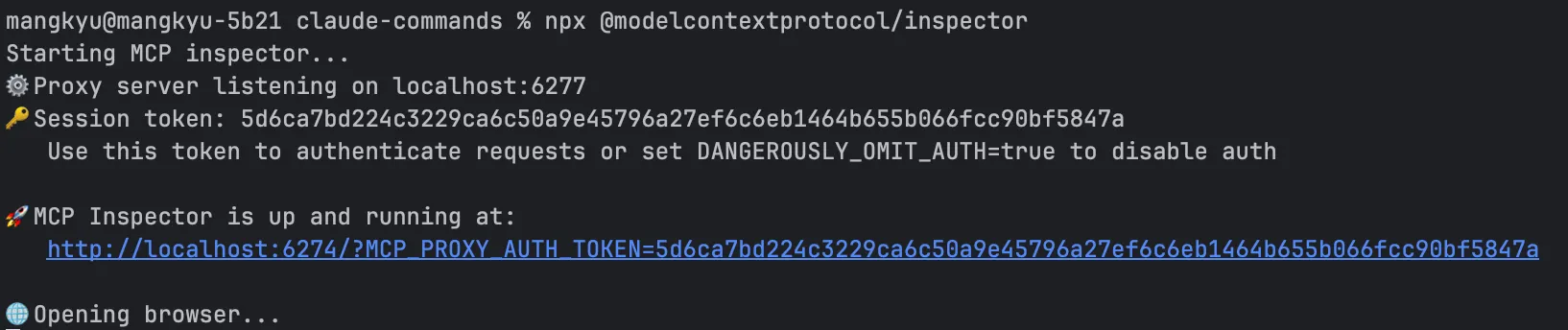 해당 명령어를 실행하면 다음과 같이 MCP Inspector가 실행되고, 터미널에서 접속 경로를 통해 접속할 수 있다.