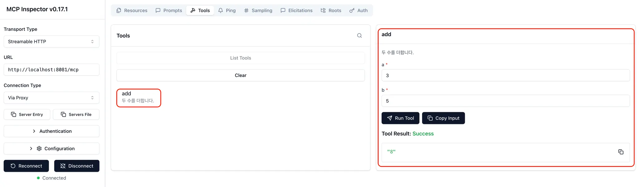 그리고 Tools 탭으로 이동한 후에 List Tools 버튼을 누르면 다음과 같이 우리가 구현한 add 라는 Tool이 존재함을 확인할 수 있다. 해당 Tool을 클릭하고 파라미터를 입력한 후에 Run Tool 버튼을 누르면 해당 Tool을 호출하여 실행 결과를 확인할 수 있다.